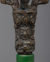 Tibetan Dorje represents the indestructibility and efficiency that overcomes all obstacles. Symbolically, Dorje Vajra destroys ignorance. In Tibetan Buddhist rituals, the vajra is often used with the bell, representing the masculine and the feminine, the ying and the yang, the effective action, and the compassion. The shape of the Tibetan Dorje is symmetrical, the two pyramidal heads representing samsara and Nirvana, which cancel each other out in its center thanks to the ring of Emptiness. Having a Dorje at home would have positive virtues against the various attacks we suffer.