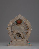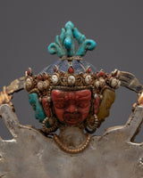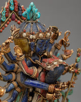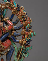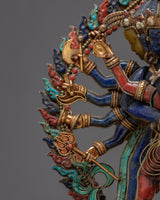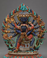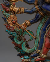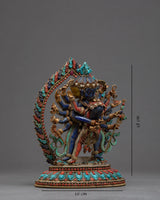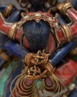 This hand-carved beautiful Chakrasamvara in Union statue with Vajravarahi is depicted with four heads and twelve arms. His three eyes symbolize the knowledge of the past, present, and future. His hands are crossed in the embracing mudra, and the vajra and bell, which represent united happiness and nothingness, are held in his hands. Along with his first two arms, embrace with vajravarahi passionately. Charasamvara is also known as Heruka.Chakrasamvara's right leg is extended and stands on the back of wrathful Ishvara's worldly deity (also known as Bhairava). In contrast, his left leg is bent and tramples on the breast of Bhairava's consort, the goddess Kalarati. This stance symbolizes the ability of Chakrasamvara to overcome the forces of ignorant hatred and desirous attachment, respectively.