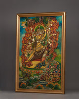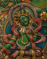 This thanka is a practical meditation tool and a gorgeous item. It elevates any sacred area or personal altar with its elaborate decorations and vivid graphics that captivate the spectator. The artwork gains depth and authenticity from the traditional methods and materials employed to protect cultural heritage.