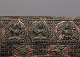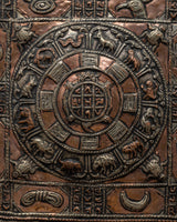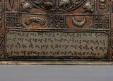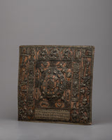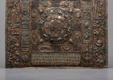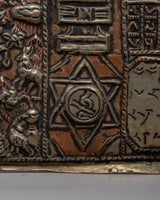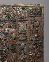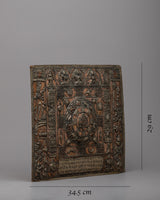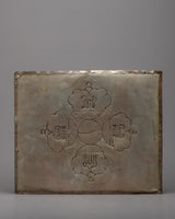 This Chenresig Calendar Thanka is a masterpiece of artistry and devotion, meticulously handcrafted on a copper body and adorned with a silver-plated finish. The intricate details and symbols on this thanka reflect the profound spiritual significance of Chenresig, the embodiment of compassion. Each element, from the carefully rendered symbols to the intricately crafted mantra, serves as a visual representation of the teachings and blessings associated with this revered Bodhisattva. The combination of skillful craftsmanship and deep spiritual intention creates a tangible connection to the teachings and ideals embodied by Chenresig. This Thanka not only offers an aesthetic delight but also serves as a meditative focal point, inviting contemplation and connection to the compassionate essence of Chenresig.