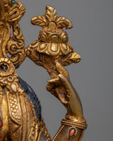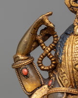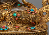 The intricate design incorporates precious coral, lapis lazuli, and turquoise stones, each meticulously inlaid to represent essential aspects of spiritual awakening. Coral represents vitality and compassion, lapis lazuli wisdom and truth, and turquoise peace and spiritual harmony. They work together to create a harmonious fusion of energies that leads practitioners toward compassion and enlightenment.