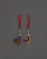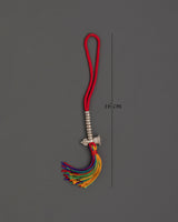 This traditional Tibetan Chupsel is 16 cm in length and weighs only 0.010 kg. It is skillfully woven from multicolored fabric threads and embellished with white metal beads to form a colorful and significant spiritual tassel. Its lightweight and vital construction, combining fabric and metal elements, makes it excellent for use as a prayer accessory or decorative element in your sacred space.