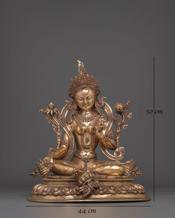 this exquisite Sacred Compassion Deity Green Tara Statue, meticulously crafted from copper. Standing 50cm tall and 44cm wide, this Tibetan Buddhist goddess embodies compassion and protection. The statue's intricate details highlight her serene expression and graceful posture, making it a powerful symbol to inspire mindfulness and calm. Perfect for meditation corners or as a meaningful decor piece, this statue invites positive energy and compassion into your home or sacred altar. Invest in this timeless representation of Green Tara to enhance your spiritual journey and inner peace.