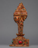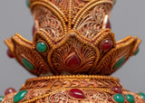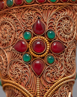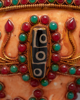The Conch Shell has a stand that is Handmade with a copper body and 24k gold plating, this lovely conch shell has a gleaming and regal appearance. The shell's embedded gemstones provide a touch of class, beauty, and spiritual significance. T The Tibetan Diz beads are embedded. The conch shell's circular blowing mechanism is especially significant because it symbolizes both the boundless nature of the universe and the never-ending cycle of birth, death, and rebirth