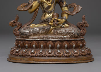 The statue's copper body is adorned with elaborate embellishments, including delicate engravings of sacred mantras, as well as a lotus pedestal that symbolizes spiritual purity and the flowering of enlightenment. The copper tones lend an antique feel to this Tibetan Vajrasattva statue, emphasizing its majesty and wisdom. This statue is not only a magnificent work of art, but also a spiritual tool—ideal for meditation spaces, home altars, or shrines—that provides the benefits of purification and inner calm.