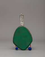 The Crystal Quartz Damaru is a powerful ceremonial drum used in Vajrayana Buddhist ceremonies, particularly Chöd and tantric rituals. This handmade damaru, constructed of crystal quartz, has 97.5 % Silver embellishments and semi-precious stones such as coral and turquoise, representing protection, knowledge, and spiritual enlightenment. The incredible red ribbons and multicolored knitted beaters amplify its spiritual energy, making it an effective prayer, meditation, and sound therapy tool.