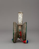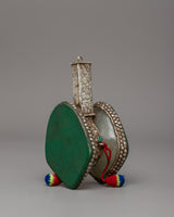This portable ritual drum, measuring 5.5 cm in height by 7.5 cm in width and weighing 0.26 kg, vibrates with deep spiritual vibrations, encouraging practitioners to connect with higher awareness and invoking the blessings of dakinis and enlightened beings. The delicate silverwork and gemstone details make this a beautiful altarpiece or a significant Buddhist present.