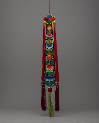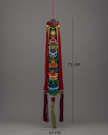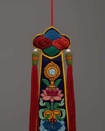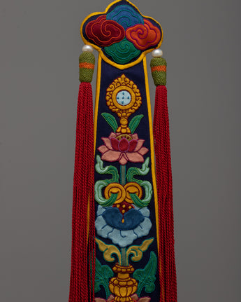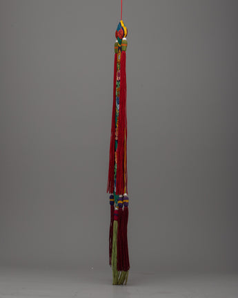 The Damaru Tail is a work of Himalayan art, delicately crafted from finest cloth with remarkable attention to detail. At its highest point, colorful lotus petals in various colors form a captivating design that draws attention with its complex beauty.