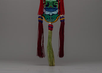 Long red tassels hang from either side of the middle embroidered part, adding to the piece's intricate design and visual appeal. Three tassels of varied hues gracefully drape from the base, completing the Damaru Tail's exquisite design. This item, whether displayed as a decorative centerpiece or utilized in ancient ceremonies, evokes appreciation for its artistry and is a tribute to the enduring legacy of Himalayan art and culture.