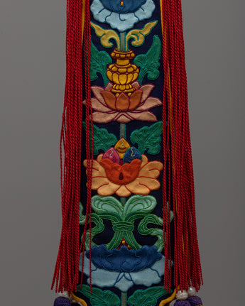 Moving to the center, vertically layered embroidered motifs reflect floral patterns and symbolic aspects common to Himalayan art. Lotus flowers, vases, and other fortunate symbols are among the motifs, all carefully framed and richly embellished with vibrant red, green, blue, yellow, and orange tones. This portion demonstrates the artisan's talent and represents the cultural richness and spiritual depth of Himalayan traditions.
