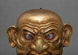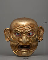 The decor mask is a gold-plated copper piece with a fierce expression that symbolizes power and strength. It measures 27 cm in height and 28.5 cm in width and weighs 0.756 kg, reflecting fine craftsmanship. The face is designed to look aged and intense, with deep wrinkles around the eyes and forehead adding to its commanding presence. The open mouth, revealing sharp teeth, enhances its wrathful and striking appearance.