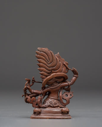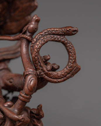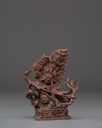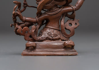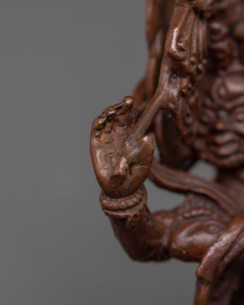 Standing at 13 cm tall with a 9 cm base and weighing 0.34 kg, this statue offers a compact yet highly symbolic presence for any altar or sacred space. The oxidized copper finish gives it an earthy, ancient aura that enhances its spiritual significance and artistic craftsmanship. The detailed motifs of wrathful expressions and ritual implements emphasize Rahula’s role as a guardian who fiercely defends Buddhist teachings and practitioners.