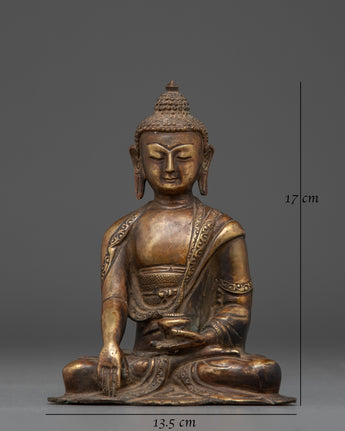 The Dharma Symbol The Shakyamuni Buddha Statue is an excellent representation of Siddhartha Gautama, the historical Buddha and Dharma teacher. This statue, which stands 17cm tall and 13cm wide and weighs 1.30kg, depicts Shakyamuni seated in the iconic lotus stance. His right hand extends toward the earth in the Bhumisparsha Mudra, representing the moment of enlightenment, while his left hand holds a sacred bowl, symbolizing compassion and knowledge. The robe's intricacy, tranquil expression, and lotus seat all imply inner harmony, peace, and waking to truth.