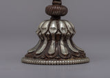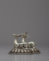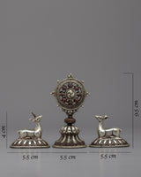 The Silver Plated Dharma Wheel is a meaningful symbol of enlightenment and Buddhist teachings, not just a pretty decoration. With two beautiful deer on both sides of the classic Dharma Wheel, this magnificent statue is handcrafted from a copper body and exquisitely silver plated. Its 3.024 kg weight makes it a striking and substantial centerpiece that encourages introspection and prayer. Excellent craftsmanship is evident in the delicate depiction of the deer and the complex features of the wheel, making this piece a must-have for anybody wishing to uplift their home decor or spiritual practice.