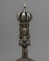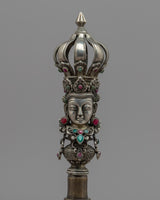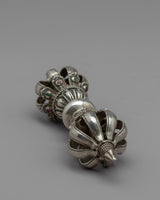 The Tibetan Dorje and Bell Set is a lovely and sacred object that has been created on a copper body and is ideal for meditation and prayer. A bell and a dorje (also known as a vajra) are included in the set, which are important ritual artifacts in Tibetan Buddhism. The bell represents the feminine principle, and the Dorje represents the male principle; their use together denotes the union of wisdom and compassion. The bell's handle is decorated with gemstones and carved with a vajra design, making it not only useful but also visually appealing. The pure and beautiful sound created by the bell and dorje is thought to purify the atmosphere as well as the thoughts of those present, assisting in meditation and spiritual pursuits.