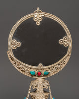 This mirror's meticulous craftsmanship, stone embellishments, and balanced design showcase Tibetan creativity and spiritual symbolism. This mirror is ideal for personal altars, meditation spaces, or as a one-of-a-kind cultural decor item, adding harmony, clarity, and an elegant touch of Himalayan culture to any sacred location.