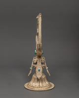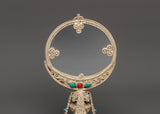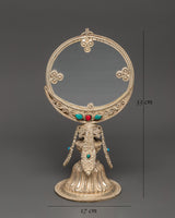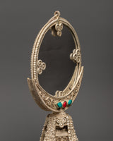 This Tibetan Double-Sided Mirror is 33cm tall, 17cm broad, and weighs 1.11kg, giving it a substantial and grounded sense suitable for ceremonial settings. This item is handcrafted from white metal and incorporates artificial stones such as turquoise and coral, which are beautifully incorporated within its intricate base and frame. The double-sided reflecting surface increases its usefulness, making it ideal for ceremonial and decorative purposes.