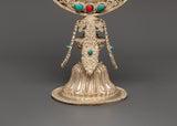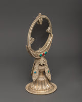 Mirrors have traditionally been utilized in Tibetan Buddhist ceremonies to represent knowledge, purity, and the ability to see outside and within. This sculpture is both utilitarian and intensely spiritual, effectively aiding meditation or ritual practice. Whether used in tantric ceremonies or put on a shrine, it encourages attentive reflection and spiritual insight.