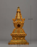 The Enlightenment Stupa in the image is a stunning example of Buddhist artistry and spiritual symbolism. At 35.5 cm tall, it has a meticulously gold-plated copper base. The stupa's lower portion is adorned with intricate floral designs that representing balance and harmony. The details evoke a sense of unity and serve as a visual representation of the stability and fundamental principles that underpin Buddhist wisdom.
