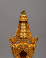 A refined spire rises from the top of the stupa, crowned with a detailed finish that serves as the structure's pinnacle. The use of gold plating enhances the stupa's sacred nature, while the solid copper body ensures its strength and longevity. The overall golden glow represents purity and divinity, providing an ideal balance of material craftsmanship and spiritual significance. This stupa is both a decorative piece and a powerful symbol of the path to enlightenment.