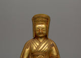 The gold plating adds a touch of divine elegance to the statue, reflecting light in a rich golden hue and increasing its aesthetic appeal. The intricate detailing on the robes and facial features demonstrate the masterful craftsmanship behind this piece. The folds and layers of Gampopa's robe are meticulously carved, with special attention paid to texture and flow, ensuring that the statue exudes dignity and elegance. His calm facial expression and intricate adornments add to the significance of this figure, which represents the wisdom and spirituality that Gampopa shared with the world.