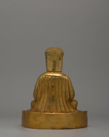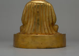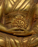 The Gampopa Statue is made of copper and finished with gold plating, giving it a rich, luminous appearance. Standing 21 cm tall and 18 cm wide, this stunning statue depicts the revered Buddhist master in a serene seated position. Gampopa is depicted with serene yet focused features, indicating his dual role as a scholar and spiritual teacher. His posture is calm and contemplative, with one hand gently holding a symbolic object and the other resting in a gesture of instruction and wisdom. This thoughtful positioning is typical of Buddhist art, emphasizing peace, enlightenment, and knowledge transmission.