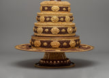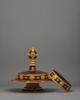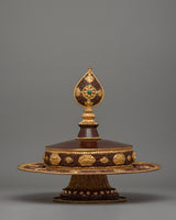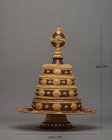 The design consists of many stacked rings with engraved symbols depicting the universe's treasures and spiritual places. The base is broad and stable, supporting the magnificent form that ends in a symbolic spire adorned with a holy circle design inlaid with turquoise stones. Each tier is embellished with flowery and auspicious designs that highlight the craftsmanship's accuracy and the spiritual importance contained in each layer. This mandala encourages abundance and provides a contemplative focus during meditation.