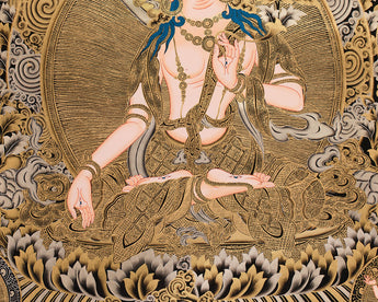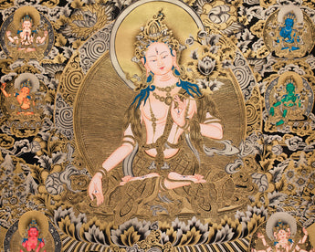 She is surrounded by a glowing halo that emphasizes her enlightened and pure nature. Tara wears priceless jewelry, including earrings and a necklace, symbolizing her divine essence and selfless service to all living beings. Several additional Buddhas and Bodhisattvas are visible in the clouds above and around White Tara. These figures depict renowned individuals such as Amitabha Buddha, Manjushri, Green Tara, Avalokiteshvara, and Vajrapani, along with other guardian Bodhisattvas. Each figure has a distinct role and meaning; Amitabha represents compassion and wisdom, Manjushri signifies wisdom, Vajrapani embodies strength and protection, and Green Tara embodies active compassion and swift protection from harm.