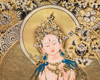 Discover the Luminous Gold Thangka of White Tara, a Buddhist deity celebrated for her endless compassion, healing powers, and ability to grant longevity. With a radiant golden glow, this hand-painted Thangka showcases her serene demeanor as she sits gracefully on a lotus base. She emanates divine energy, wisdom, and tranquility. Her seven eyes—one on her forehead, two on her palms, and two on the soles of her feet—represent her infinite wisdom and steadfast dedication to safeguarding all sentient beings. This gorgeous piece of art has been expertly hand-painted with vibrant acrylics, ensuring a rich, lasting finish. It features gold and silver accents on a deep black canvas, creating a vivid contrast that enhances its sacred essence.