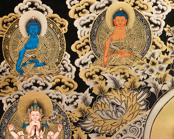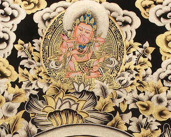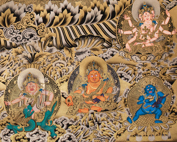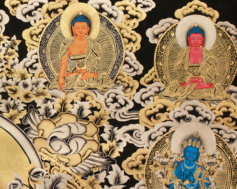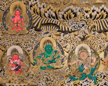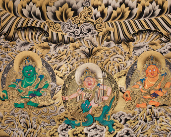 Long-life deities such as Amitayus and Ushnishavijaya symbolize blessings for longevity. At the same time, the Five Forms of Dzambhala are regarded as wealth deities in Buddhism, both of which can be found beneath White Tara. Each form; Yellow, Green, Red, and White Dzambhala, possesses unique abilities to provide prosperity, wealth, and spiritual well-being. Additionally, cloud motifs are interwoven throughout the background, enhancing the Thangkas' ethereal and divine ambiance. Below White Tara, the lotus petals represent purity, spiritual development, and the emergence of inner understanding. This spiritual artwork serves as a powerful meditation aid, fostering serenity, healing, and longevity in its presence.