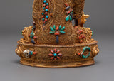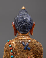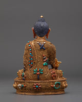 This Healing Buddha Bhaiṣajyaguru Statue enhances any holy place or meditation altar, bringing tremendous energy and healing benefits. This piece, made of copper, gold plating, and semi-precious stones, elegantly combines spirituality with artistic design. Embrace the Medicine Buddha's power and bring calm and healing into your life with this magnificent Buddhist statue.