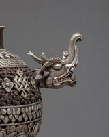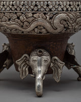Our silver coated incense burner is a high quality finely handcarved burner with various traditional details. The elephant base representing the endurance, self-control, patience, gentleness, and power of buddha. Similarly, the Makara handle, an ancient symbol of power; dragons have long symbolized power, creativity, heaven, and good fortune; the Knot of Eternity represents the intertwining of wisdom and compassion, the perfection of knowledge.