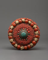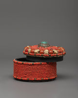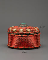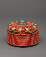 The box is beautifully embellished with elaborate beading, a turquoise stone centerpiece, and symbolic items representing spiritual protection and benefits. This jewelry box is ideal for use on altars or as a decorative component in any mindful area, and it is a meaningful and soulful gift for spiritual practitioners and Tibetan cultural collectors.