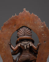 Kal Bhairav is represented with a ferocious yet controlled expression and a posture that exudes strength and stability. The oxidized copper finish lends it a sacred appearance, while the silver plating adds a touch of elegance and a magnificent brightness. The figure is exquisitely carved, with delicate decorations on its crown, ornaments, and the flames of transformation behind it, making it a valuable addition to any spiritual collection.