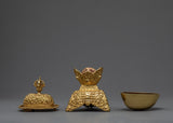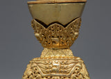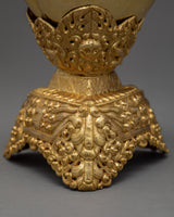 In Buddhist offerings, Kapala is a ritual bowl used to hold bread or dough cakes, torma, and wine instead of blood and flesh as offerings to wrathful deities. This gold-plated ritual bowl is beautifully hand carved with fine detailing and exceptional craftsmanship.