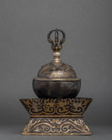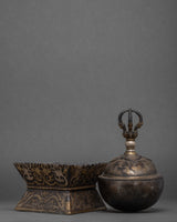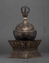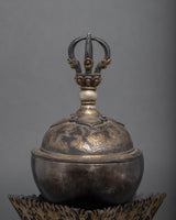 Our beautiful kapala is handmade in Nepal. Our product is entirely handmade. The uppermost part of the cup holds a half vajra. This will be a great symbol to represent great bliss and a symbol of impermanence.