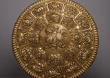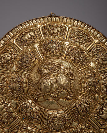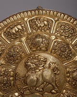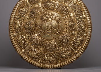 The careful carving of every sign of the Tibetan Zodiac around the edge of this wall hanging is what really sets it apart. This deliberate integration gives the piece of art a deep symbolic meaning and cultural depth, turning it into an alluring symbol of spiritual inquiry and awe. A striking reminder of inner strength, bravery, and life's cyclical nature, the Round Brass Lion Wall Hanging Mandala can be found hanging on the walls of homes, meditation areas, or spiritual sanctuaries.