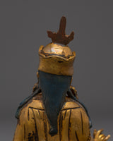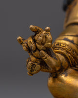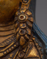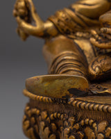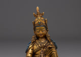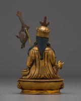 The Meditation Idol Guru Rinpoche Statue depicts Padmasambhava, the renowned Buddhist master known as the "Lotus-Born." Guru Rinpoche is revered as the founder of Vajrayana teachings in Tibet, as well as a guide who removes barriers and provides enlightenment and spiritual clarity to practitioners. This exquisitely carved figurine made of copper with gold-plated details depicts him seated in meditation, exuding calm and a strong spiritual presence.