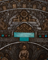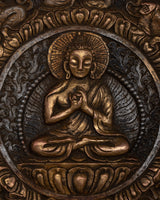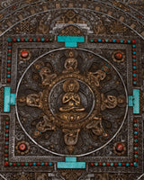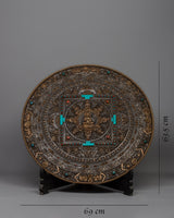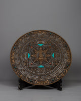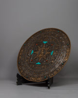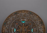 The Tibetan Large Round Wall Hanging is evidence of the skill and profundity of Tibetan artistic expression. Crafted from iron by hand and maybe embellished with opulent 24k gold plating, this piece radiates sophistication and cultural depth. Its fantastic detail and symbolic meaning draw attention, carefully inlaid with old genuine gemstones like coral and turquoise to create a vivid mosaic.