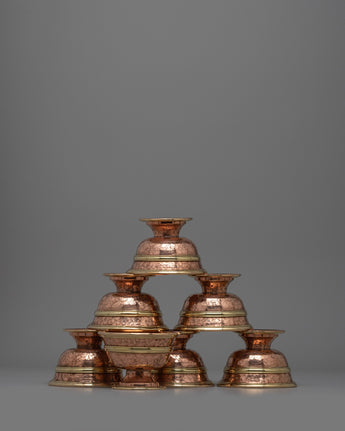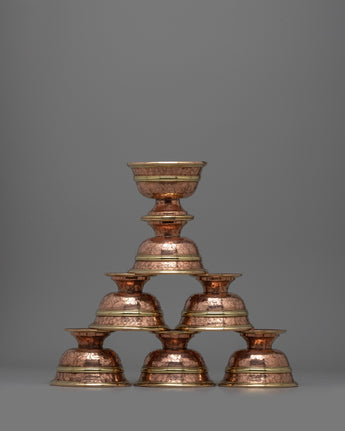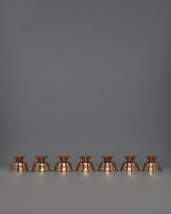 This offering set includes seven separate bowls, each tailored to a specific type of offering. Traditionally, these presents include water for drinking and washing, flowers, incense, light, smell, and food, representing the pinnacle of generosity and dedication. The bowls are positioned in a straight line to represent the universe's harmony and balance. Their spherical form and brass-plated finish represent the cyclical essence of existence and the never-ending flow of blessings. This set, when used in daily rituals or extraordinary ceremonies, represents the practitioner's intention to cultivate compassion, mindfulness, and spiritual connection.