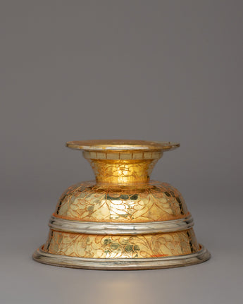 The bowls' middle and top sections are silver-plated, while the lower part is gold-plated, resulting in a dramatic two-tone contrast. This delicate combination of silver and gold demonstrates superb craftsmanship, with the cool silver tones complementing the warm gold. The floral carvings are intricate and symmetrical, capturing the grace and calm of sacred Tibetan items. Incorporating gold and silver accents boosts their visual appeal and spiritual importance, making these bowls ideal for ceremonial use.