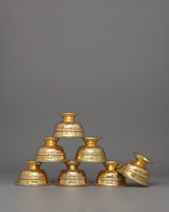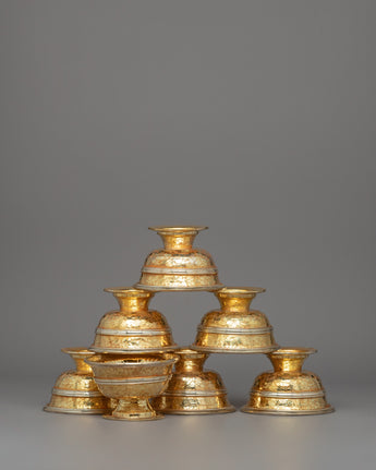 Each bowl is 7 cm high, 10.5 cm in diameter, and 6.7 cm in base, making it suitable for ritual offerings. Their small size makes them easier to transport while maintaining an exquisite and religious appearance. The complete set weighs 1.362 kilograms, with each bowl weighing 0.200 kg.
