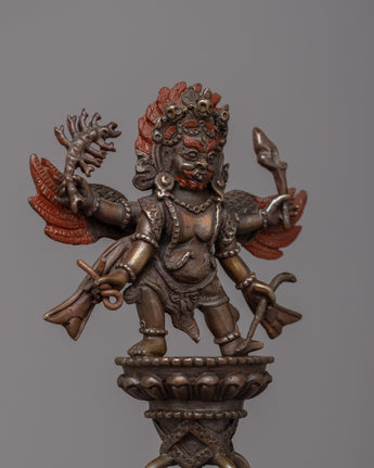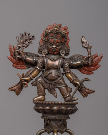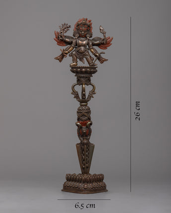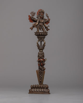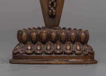 The Oxidized Copper Phurba will transport you to a world of exquisite Tibetan craftsmanship. This 26cm ritual dagger, which was hand-molded on a genuine oxidized copper body, is both profoundly symbolic and exquisitely crafted. This 0.69kg masterpiece, which features a Deity that has been painstakingly crafted at the peak and is supported by a dedicated stand, promises to be an important addition to any collection.