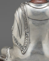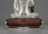 Shakyamuni Buddha is seen seated in the Bhumisparsha Mudra (earth-touching gesture), which represents his moment of enlightenment under the Bodhi Tree. His tranquil look represents the peace and knowledge obtained from meditation and awareness, making this monument an effective reminder of the path to enlightenment. This figure has a distinct style thanks to its craftsmanship and silver-plated finish, making it suitable for individuals looking for a meaningful spiritual object to complement their practice.