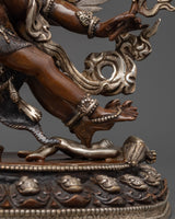 This beautiful Oxidized Vajrakilaya statue is 12.6" (32 cm) tall with a base width of 10.6" (27 cm) and weighs 6.08 kg. The figure is expertly constructed from Silver-Plated Oxidized Copper and accented with Gold Acrylic Paintings, giving it a vintage yet regal aspect. The meticulous workmanship on Vajrakilaya's furious countenance, weaponry, and adornments depicts the divine power and might that he represents.