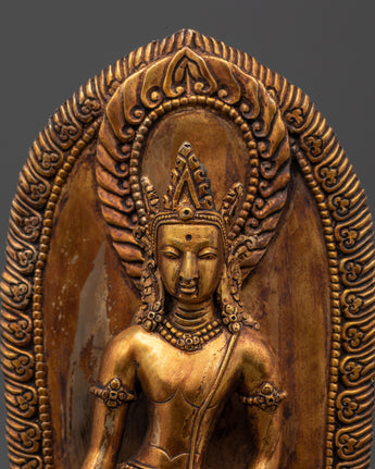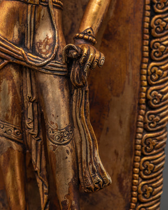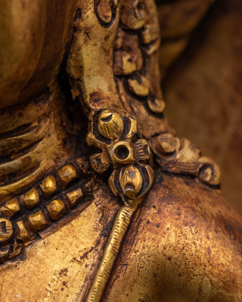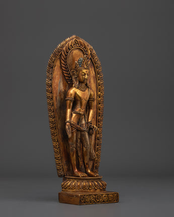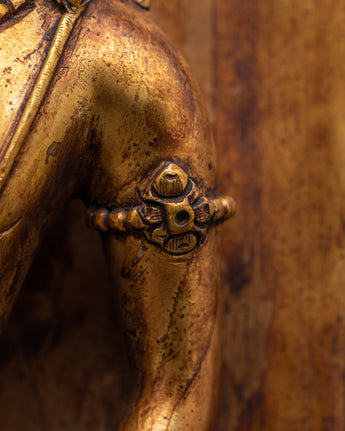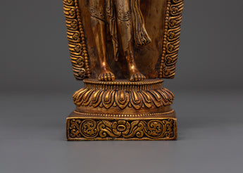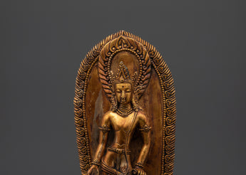 The Padmapani statue measures 27.5 cm in height and 11 cm in width, weighing 1.53 kg. This exquisite sculpture, crafted from gold-plated copper, depicts Padmapani, a revered Bodhisattva who embodies compassion and mercy in Buddhist traditions. Padmapani is depicted in a beautiful stance in the statue, representing tranquility and generosity. Its gold-plated copper body gives it a rich and dazzling appearance, making it a beautiful and spiritually uplifting addition to any home or meditation place.