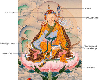 Guru Rinpoche, also Guru Padmasambhava meaning "Lotus Essence," a symbol of spiritual peace, manifests and teaches Mandarava to transform negative energies into human and peaceful forms. We follow the Buddhist text and iconography detail to present all the right attributes for your meditation practice.