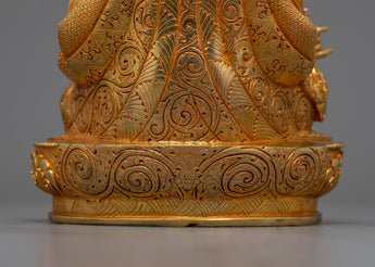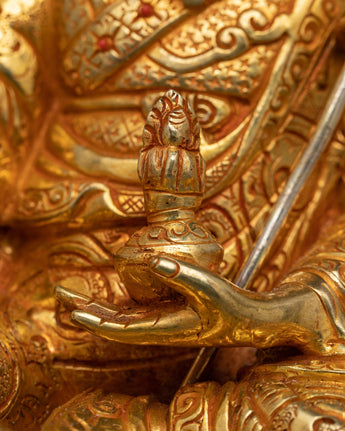 The statue is expertly constructed from copper and is embellished with a sumptuous 24K gold gilding, which is accented with delicate gold and acrylic paintings. These nuances bring to life Guru Rinpoche's charismatic and strong presence, also known as Padmasambhava, who is credited with introducing Buddhism to Tibet. This statue's painstaking craftsmanship not only portrays the likeness of this great spiritual teacher, but also represents the richness and depth of Tibetan Buddhist tradition.