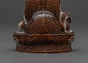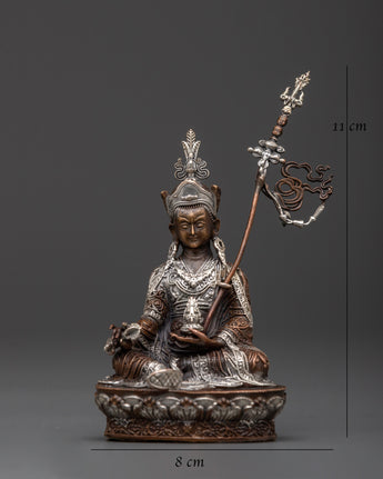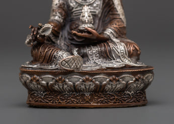 This Guru Rinpoche—Padmasambhava statue, renowned as the Second Buddha and creator of Vajrayana, represents tremendous spiritual mastery. This oxidized copper Guru Rinpoche statue stands 11 cm tall and 8 cm wide, weighing 0.15 kg. The elaborate silver plating showcases the rich decorations on his garments, crown, and ceremonial tools. The artistry shows Guru Rinpoche's spiritual intensity and calm while reclining on a lotus base.