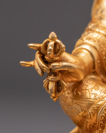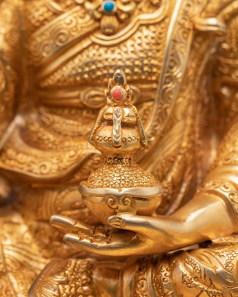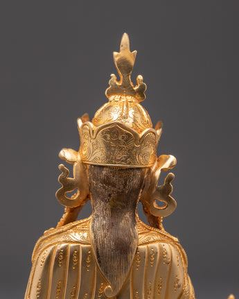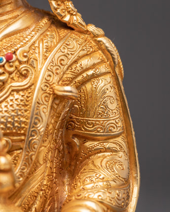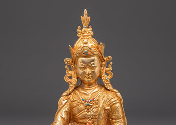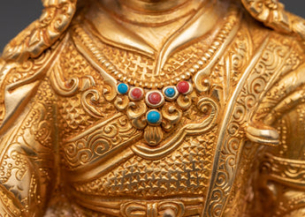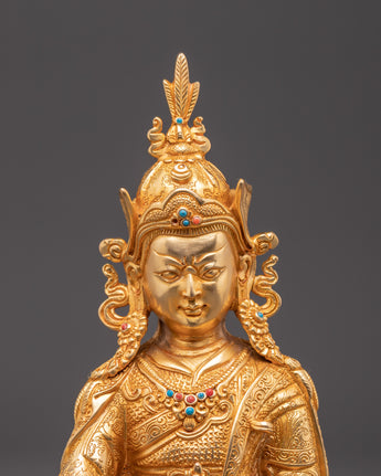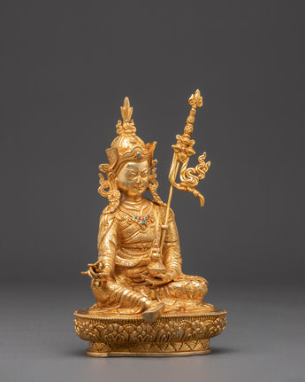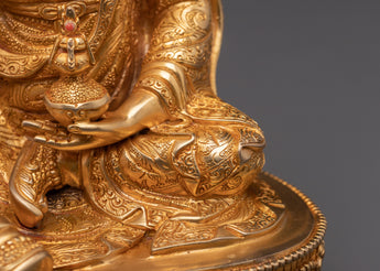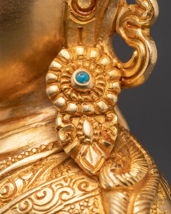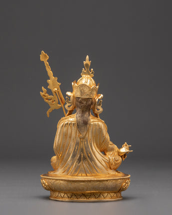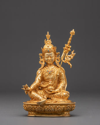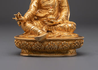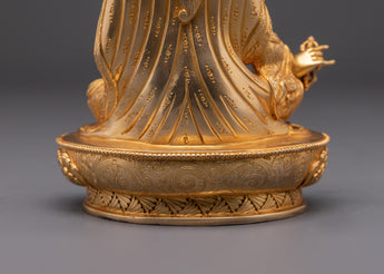 Crafted from copper, the statue is meticulously detailed, showcasing the intricate robes, posture, and presence of Guru Rinpoche. The electro gold plating further enhances the statue’s divine quality, imbuing it with an aura of sacred energy. The gold finish also emphasizes the symbolism of Padmasambhava's spiritual mastery, enlightenment, and transformative power, making it an ideal piece for those seeking spiritual guidance or blessings.